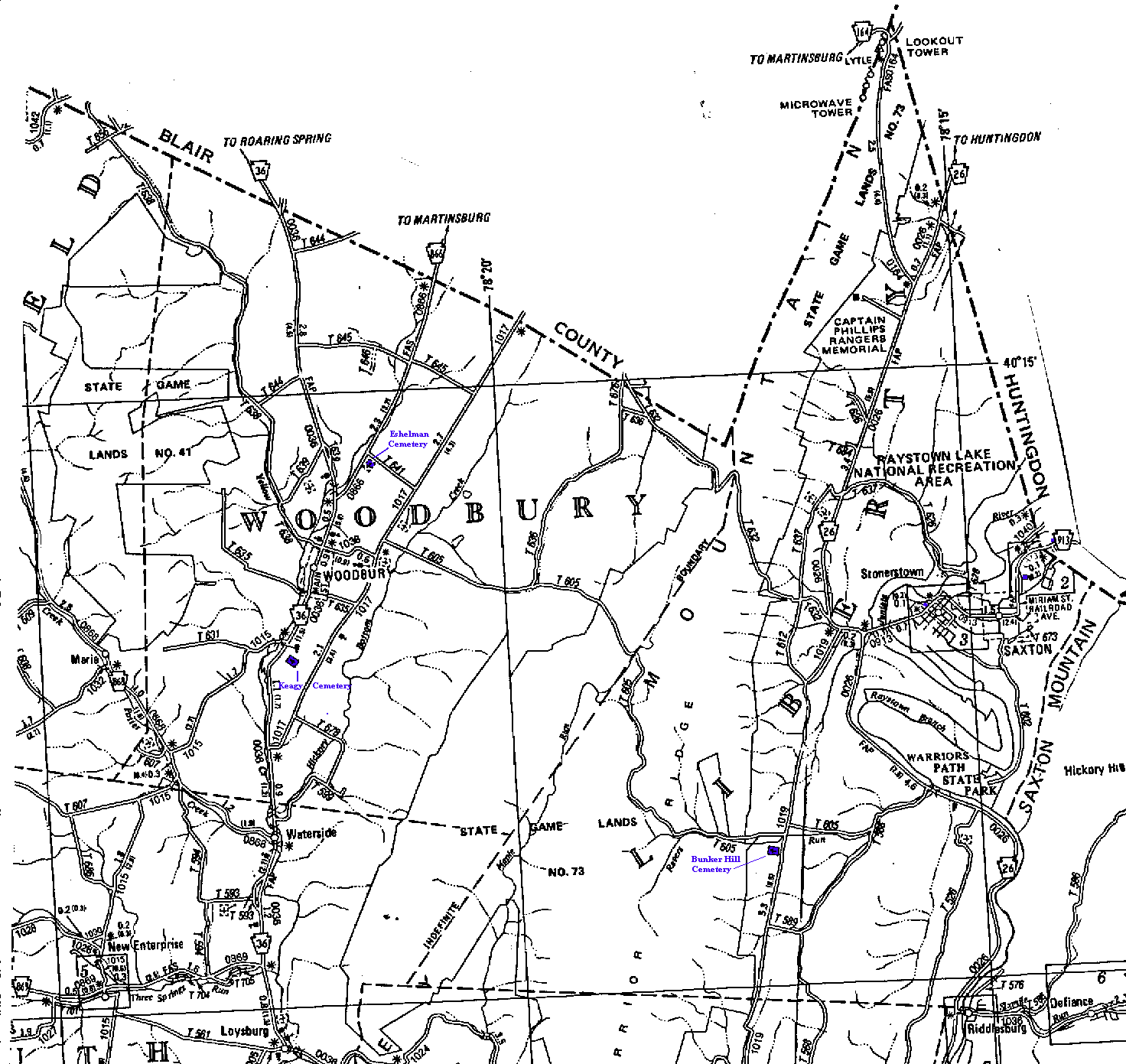 To identify the locations of these cemeteries on the map below, move the pointer onto the map - using the scroll bars at the right and bottom of the page - and locate a cemetery symbol that has been colored blue (the pointer will turn into a pointing hand when it is located at the correct position). Then click on the spot and you will jump back to the cemetery list. The correct name will be at the top of the list.